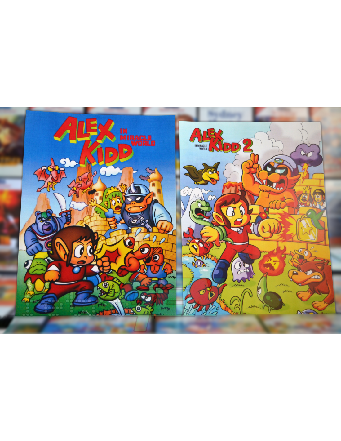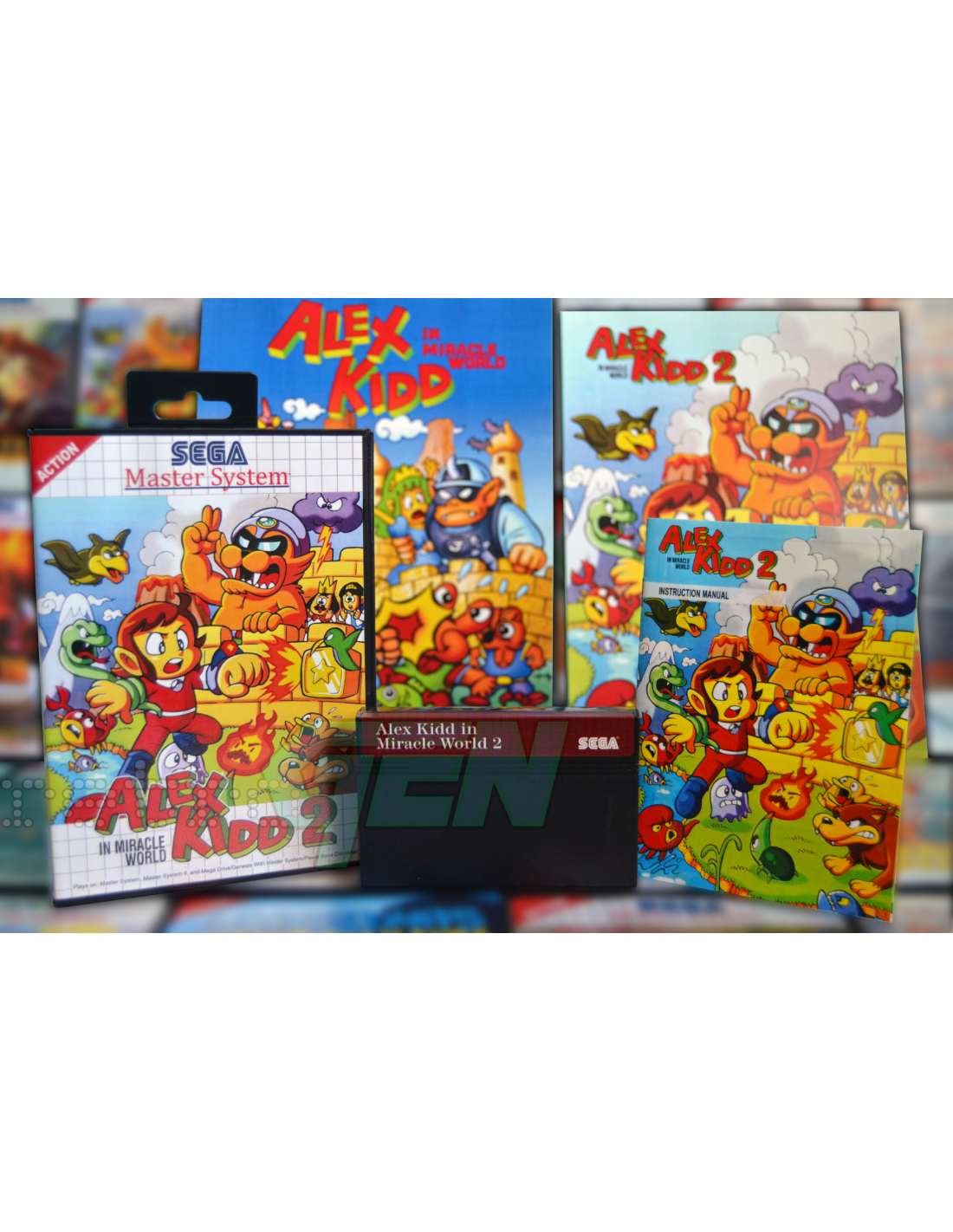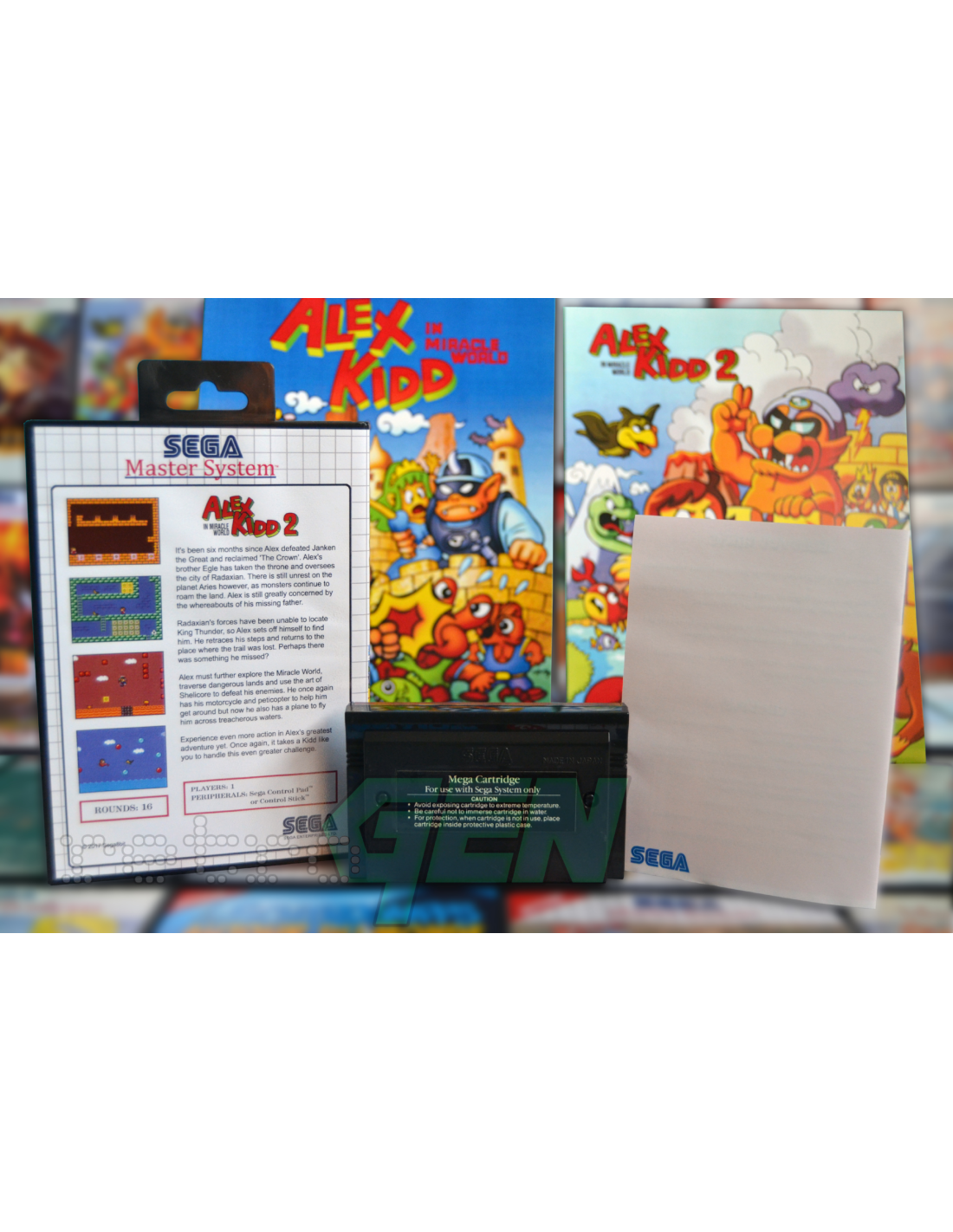 Video game homebrew Alex Kidd in Miracle World 2 for Sega Master System console. Includes box with cover, game cartridge, color manual and two posters.